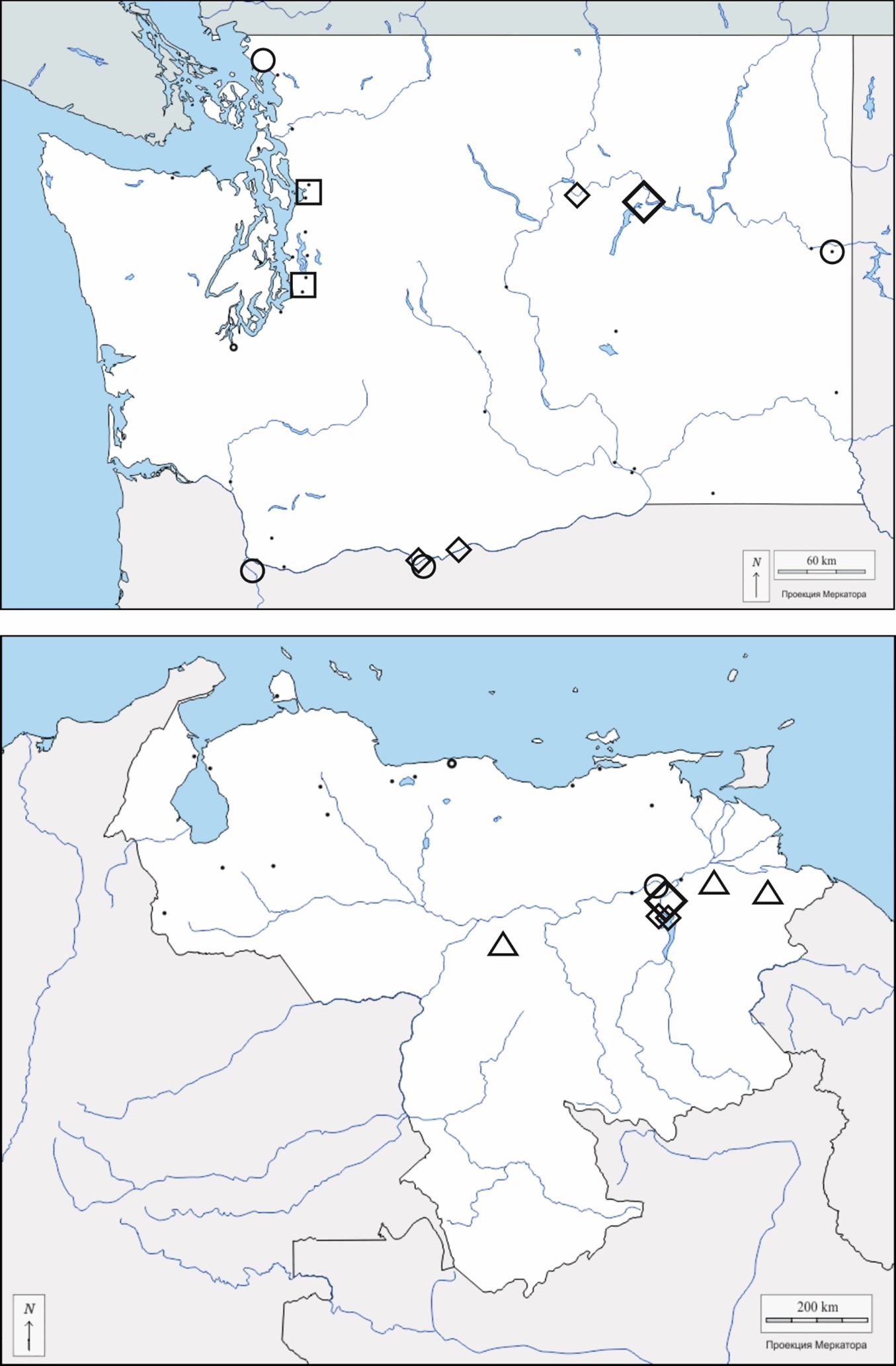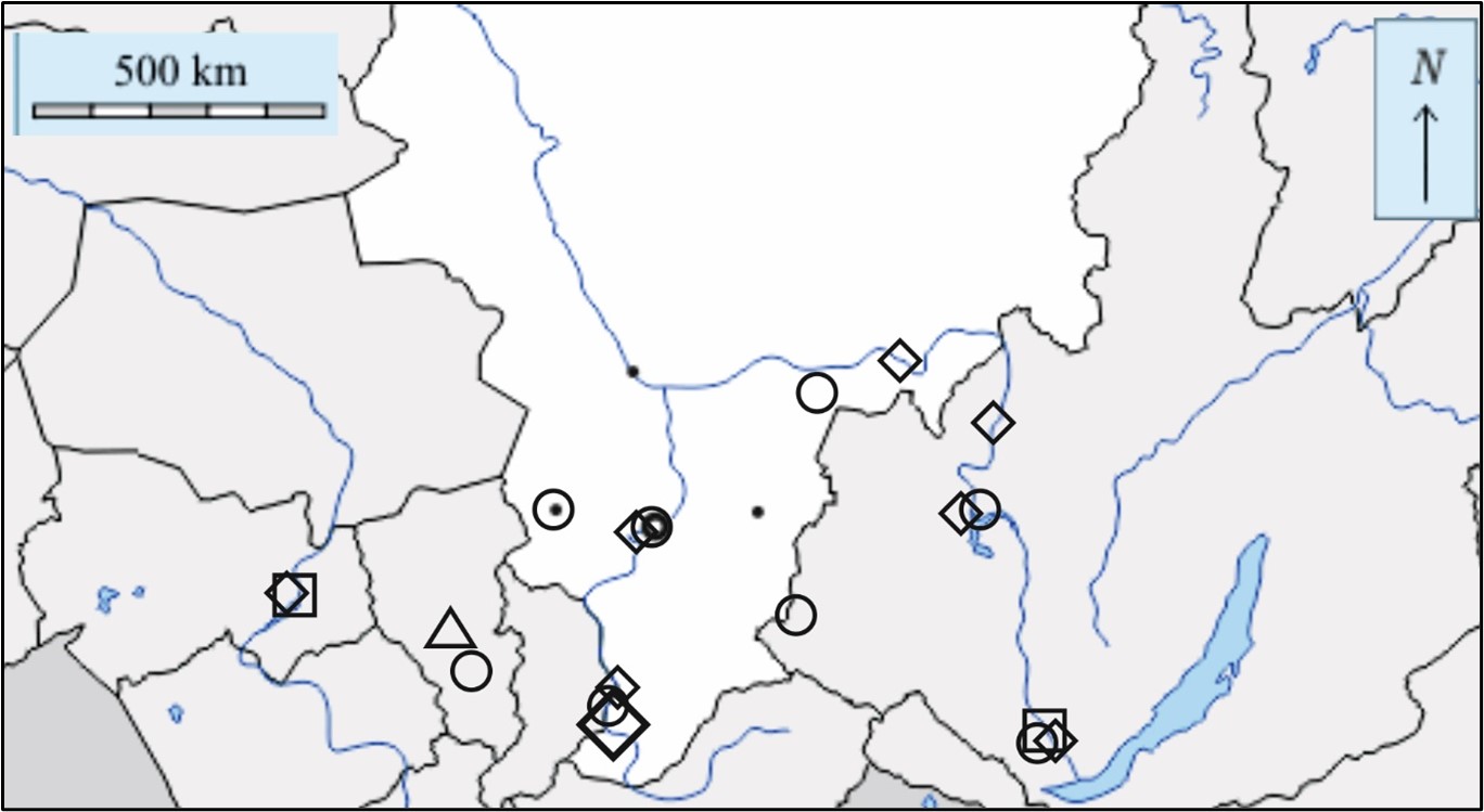 На контурных картах на Рисунках 6.А – 6.Г показано размещение связанных между собой промышленных объектов. Крупнейшие в своих странах объекты одного из типов выделены размером соответствующего условного знака.