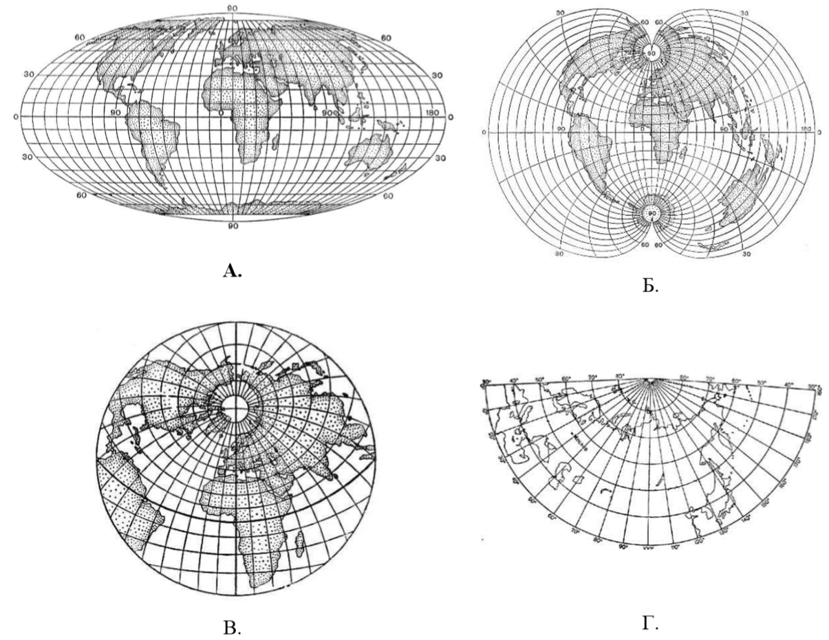 Какая из изображённых на рисунках А—Г картографических проекций является псевдоцилиндрической и считается наиболее удобной для изображения океанов?