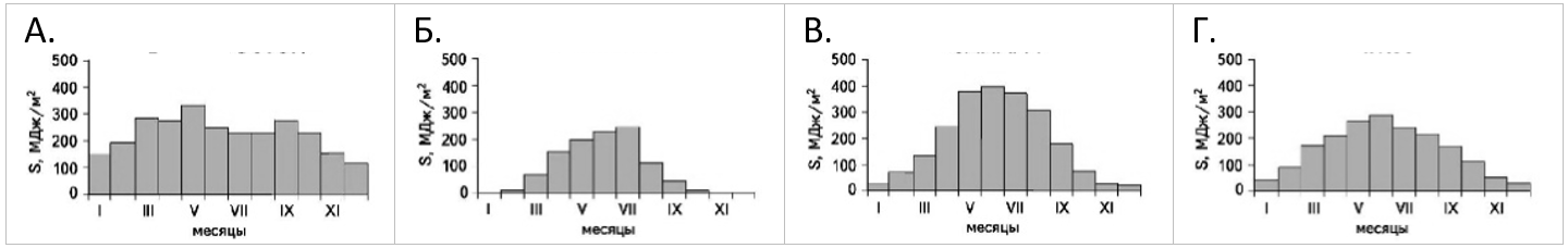 На каком из рисунков показан годовой ход прямой солнечной радиации в Мурманске?